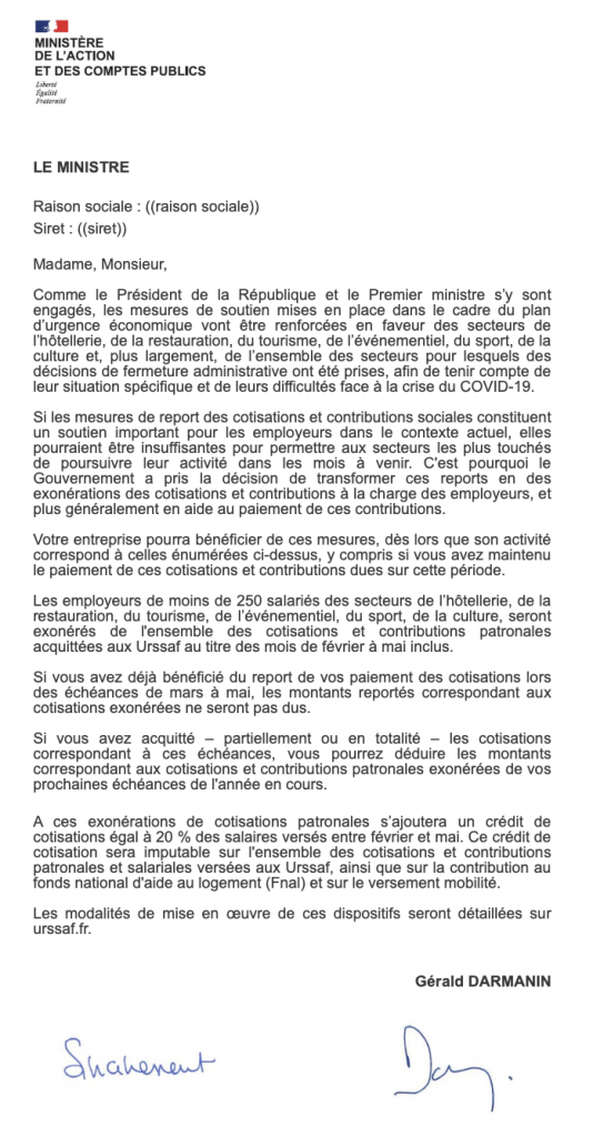 - Plan d’Urgence Economique : Exonérations des charges sociales pour les secteurs touchés par l’obligation de fermeture administrative